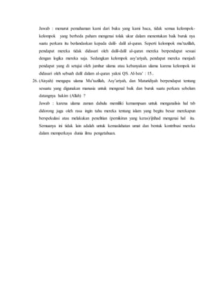Golongan asy'ariyah berpendapat tidak ada yang bersifat baik dan buruk menurut esensinya. 1.ia memahami atau mengetahui titah allah tersebut yang menyatakan bahwa ia terkena tuntutan dari allah. Dalam istilah ulama' ushul fiqh, yang dimaksut mahkum fih atau obyek hukum adalah perbuatan itu sendiri. Mahkum alaih berarti subyek hukum, yaitu seseoarang yang dibebani hukum. Yang kedua dilihat dari hak yang terdapat didalam perbuatan itu.
