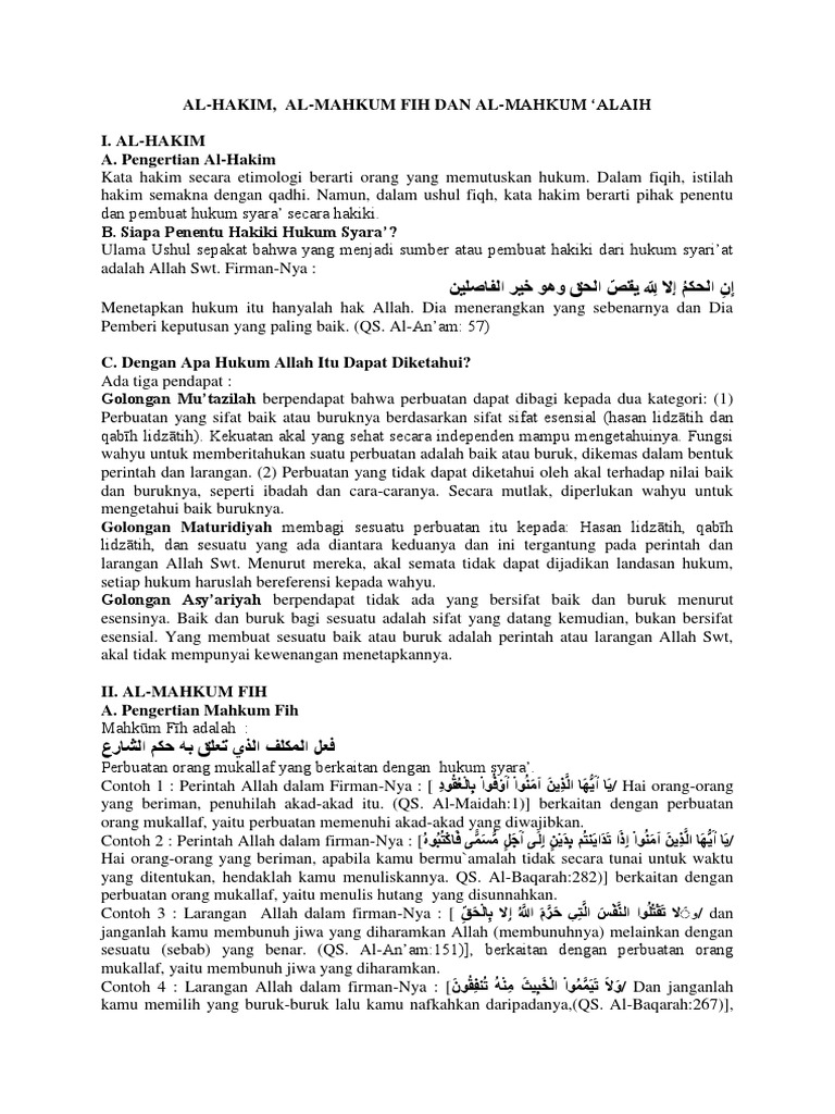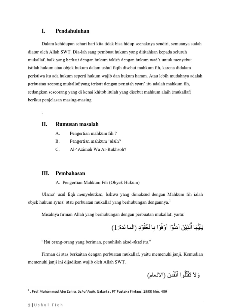 Http Repositori Uin Alauddin Ac Id 380 1 Misbahuddin 201 Pdf from Dalam makalah ini penulis akan membahas mengenai pengertian hakim, hukum, mahkum fih, dan mahkum alaih dalam rangka memenuhi tugas ushul fiqh lanjutan. (seperti:wajib,sunnah,haram,makruh,mubah,maupun yang terkait) dengan hukum wad'i (seperti:sebab,syarat,halangan,sah,batal,fazid,azimah dan rukhsoh).untuk menyebut istilah hukum atau objek hukum dalam ushul fiqih disebut mahkum fih,karena didalam peristiwa itu ada hukum seperti hukum wajib dan hukum haram.atau lebih mudahnya adalah perbuatan seorang mukallaf yang terkait dengan perintah syari. Unsur hukum didalam agama islam ulamaq usul, menyebutkan ada dua macam, mahkum fih dan mahkum alaih. Pembahasan keempat tentang mahkum fih (objek hukum); Tentu dasar hukum ini memiliki filsafat dibaliknya. Yang dimaksud mahkum fih adalah perbuatan mukallaf yang berhubungan dengan hukum syar'i, seperti wajib, sunah, haram dan makruh. Dan adanya perkara tersebut tidak memastikan timbulnya hukum. Para ulama pun sepakat bahwa seluruh perintah.